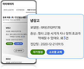SmartThings App.과 연동하여 고객님의 제품 증상에 따라 홈페이지에서 맞춤 정보 제공 및 출장서비스 예약, 소모품 구매 등 쉽고 빠르게 문제를 해결할 수 있도록 제공하는 서비스 입니다.