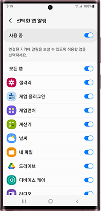 스마트폰 Samsung Flow의 선택한 앱 알림 관리에서 알림 앱 리스트를 관리하세요. 스마트폰의 알림을 받고자 하는 앱의 알림 허용 상태를 확인하세요. 알림허용상태가 OFF되어 있다면 ON으로 변경 후 사용해 주세요.
