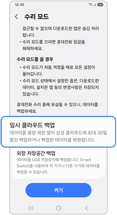갤럭시, 수리 모드의 임시 클라우드 백업 기능은 무엇인가요?