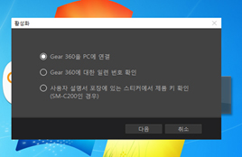 - 3. 활성화 팝업에서 GEAR 360을 PC에 연결 OR GEAR 360에 대한 일련번호 학인을 선택하여 진행합니다.