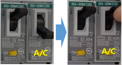에어컨 전용차단기를 내린 후 약 1분 정도 후에 올려 작동시켜 보세요.