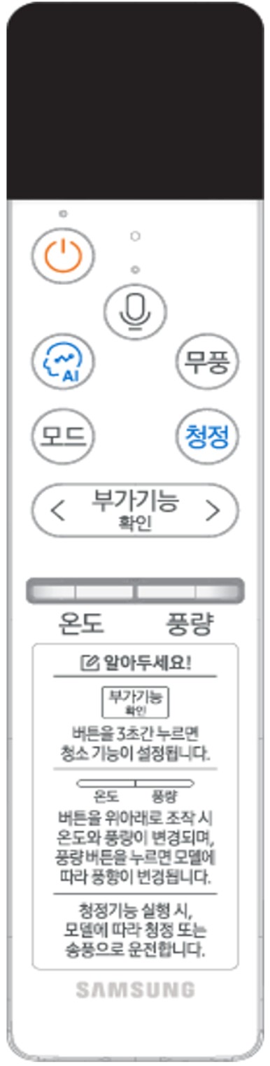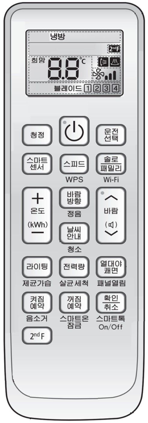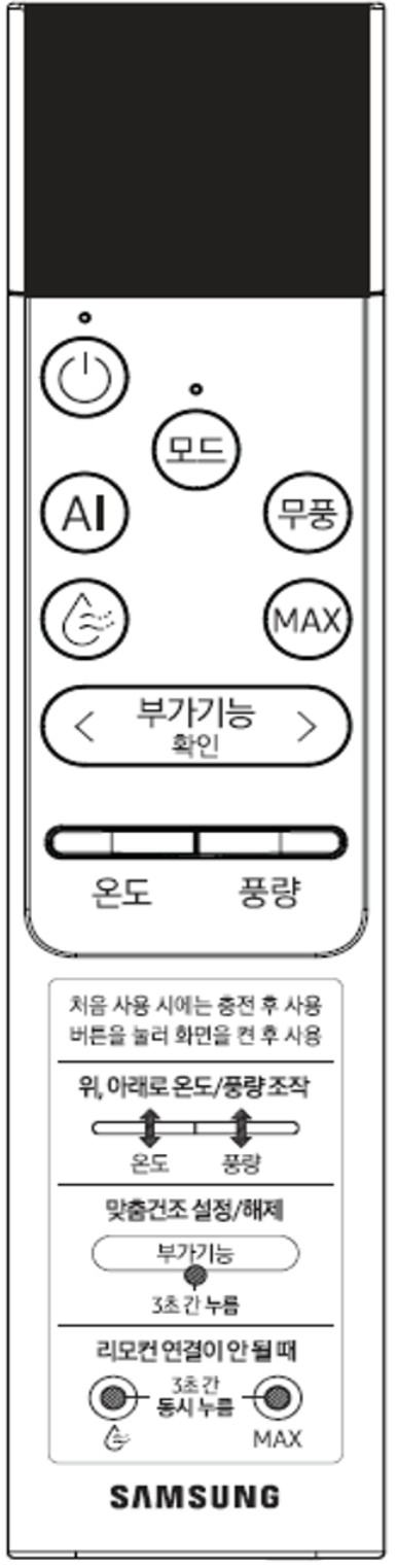 - 18년 이후 제품 중 부가기능 위 2개 버튼을 3초 이상 길게 눌렀을때 리모컨 연결중 표시가 나오는지 확인해 보세요