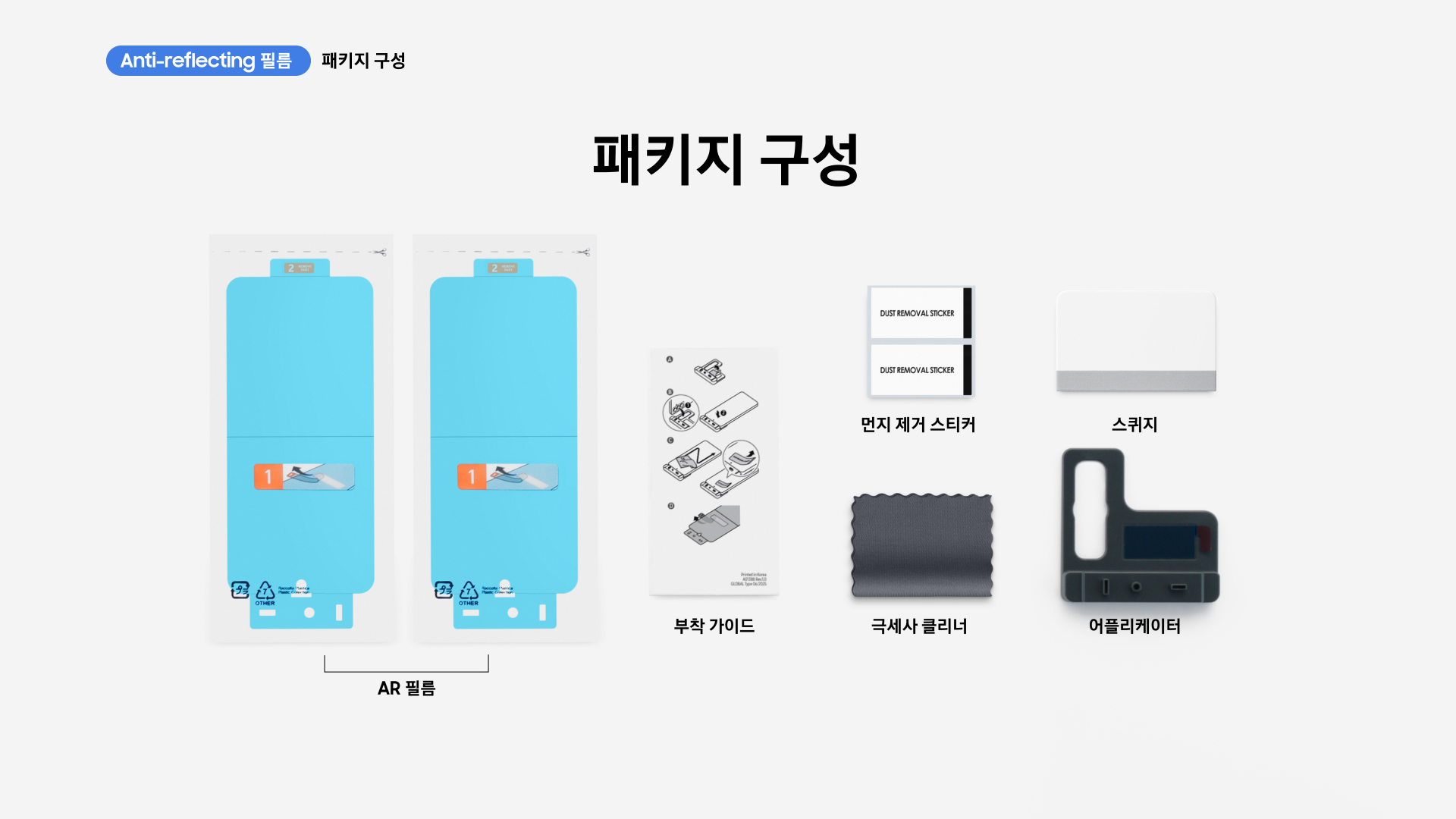 AR 필름(2매), 어플리케이터(1개), 먼지 제거 스티커(2매), 부착 가이드(1매), 극세사 클리너(1개), 스퀴지(1개)